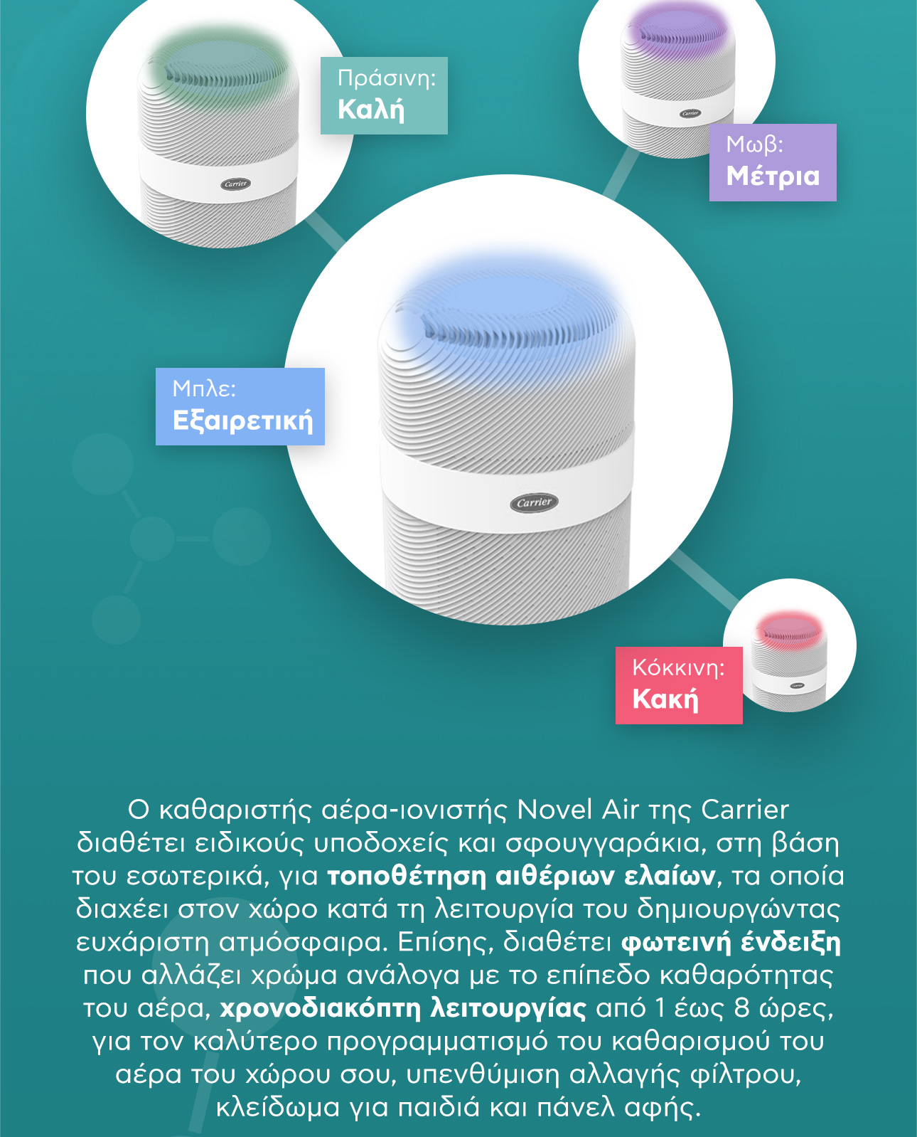 O καθαριστής αέρα Novel Air της Carrier διαθέτει ειδικούς υποδοχείς και σφουγγαράκια για τοποθέτηση αιθέριων ελαίων, τα οποία διαχέει στο χώρο κατά τη λειτουργία του.Τα αιθέρια έλαια χρησιμοποιούνται στην αρωματοθεραπεία, μία γνωστή ολιστική πρακτική θεραπείας μέσω της όσφρησης.