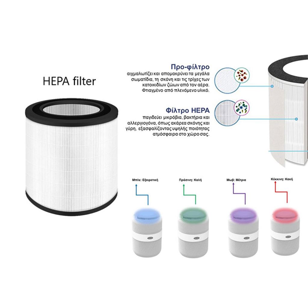 Το πανίσχυρο φίλτρο High-Efficiency Particulate Air κλάσης H13 παγιδεύει περισσότερα από το 99,95% των μικροσωματιδίων του αέρα, όπως μικρόβια και αλλεργιογόνα, εξασφαλίζοντας υψηλής ποιότητας ατμόσφαιρα στο χώρο σας